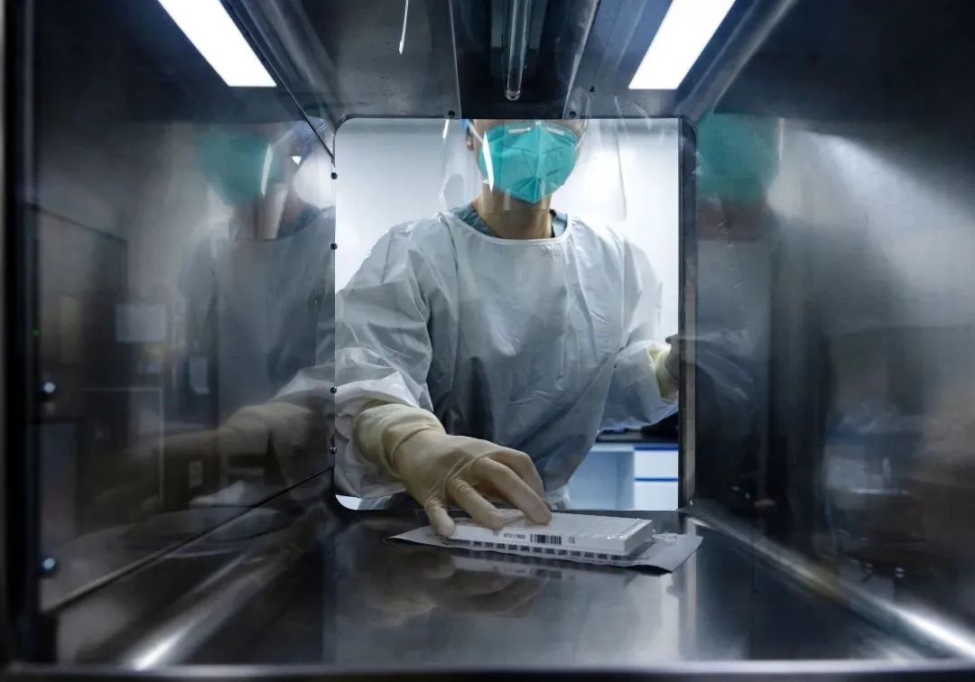4 月 28 日,杭州,检测人员通过传递窗接收样本。图源:视觉中国