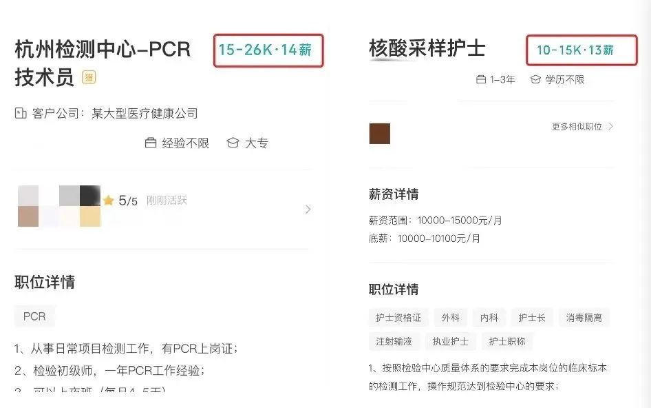 热潮推动着这一领域,采样、检测人员的薪资也相应提高。某招聘网站显示,杭州一些民营检测机构招聘采样护士,薪资为 1~1.5 万元/月,学历不限,要求持护士证上岗,享受 13 薪待遇。招聘需求基本 20 人起,有些超百人。