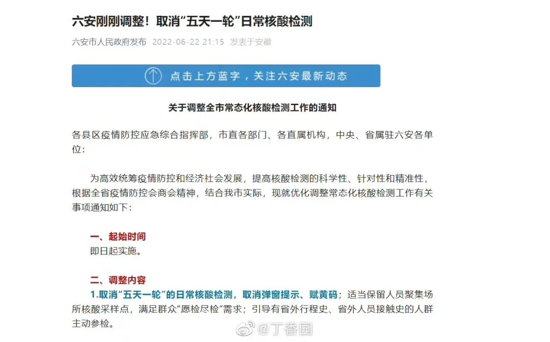 而进入 6 月,多个城市都取消了常态化核酸检测。例如安徽省合肥市 6 月 22 日起就暂停七天一次的常态化免费核酸;安徽省六安市也于同一天取消「五天一轮」的日常核酸检测,取消弹窗提示、赋黄码,适当保留人员聚集场所核酸采样点,满足群众「愿检尽检」需求。