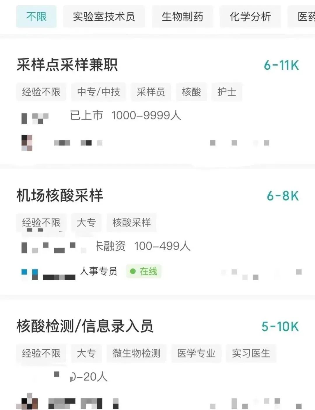 而不足一个月后,随着多地常态化核酸取消,岗位需求量也随之变化。如今在第三方招聘网站上,曾经高薪采样员岗位下架不少,目前的几个「核酸采样员」岗位的薪资多在 6000~8000 多元不等。
