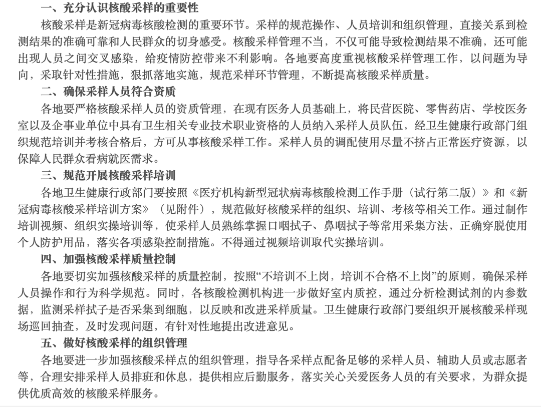 同时,《通知》还要求,「各地要切实加强核酸采样的质量控制,按照『不培训不上岗,培训不合格不上岗』的原则,确保采样人员操作和行为科学规范。同时,各核酸检测机构进一步做好室内质控,通过分析检测试剂的内参数据,监测采样拭子是否采集到细胞,以反映和改进采样质量。卫生健康行政部门要组织开展核酸采样现场巡回抽查,及时发现问题,有针对性地提出改进意见」。