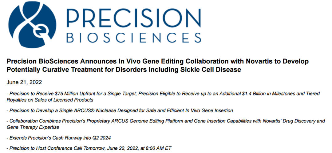 Precision将获得7500万美元的预付款,并有资格获得总计约14亿美元的额外里程碑付款。Precision也有资格获得一定的研究资金,如果诺华成功地将合作的一款疗法商业化,Precision将从产品销售中获得中等个位数到低两位数不等的专利使用费。