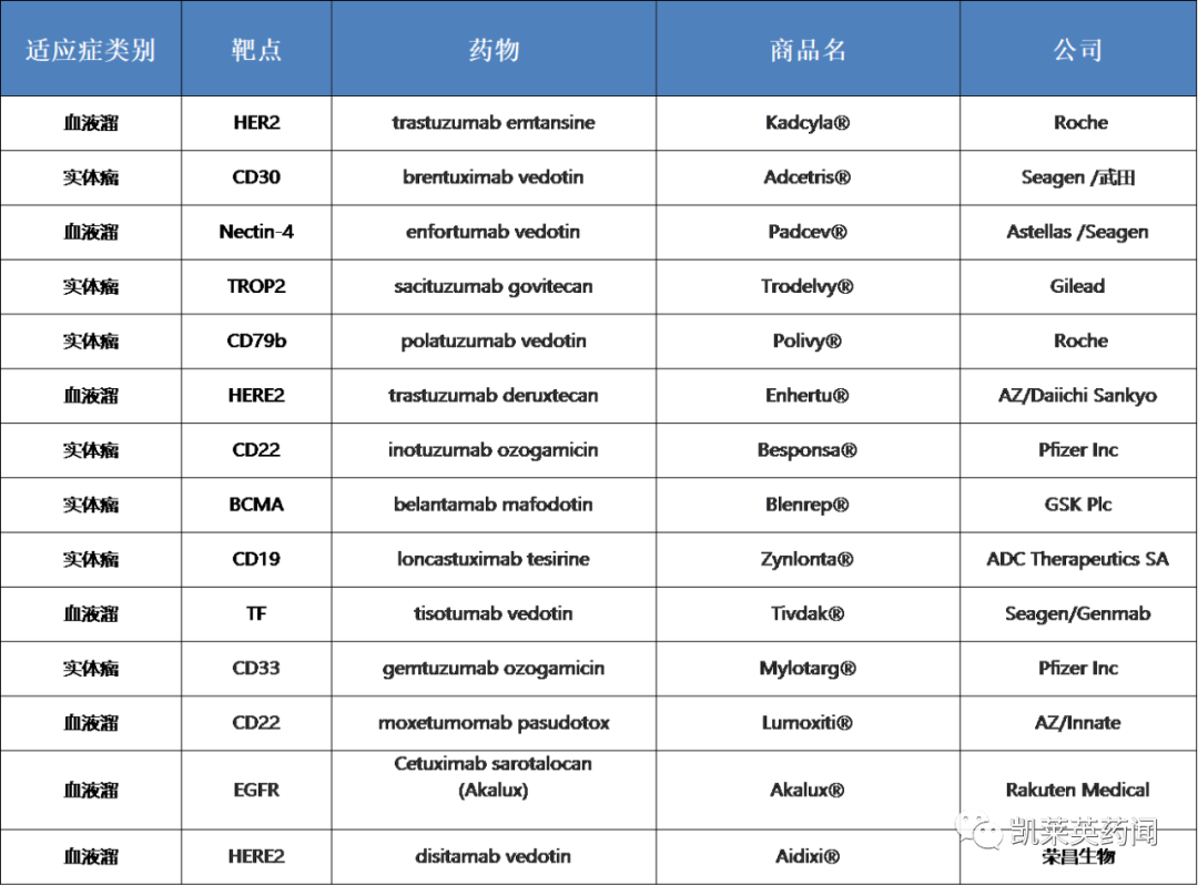 (1)trastuzumab emtansine(Kadcyla®,T-DM1):首款治疗乳腺癌的ADC,目前史上销售额最大