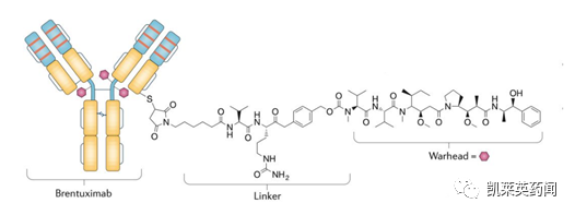 结构设计上,Adcetris是由靶向CD30的单抗cAC10(SGN-30)与阻止微管蛋白聚合进而抑制有丝分裂的Monomethyl auristatin E(MMAE),通过一个可被蛋白酶切割的接头连接而成。CD30抗原蛋白是霍奇金淋巴瘤(Hodgkin lymphoma, HL) 癌细胞过度表达的靶点, Adcetris 通过其抗体部分特异性靶向CD30靶点, 将微管蛋白抑制剂MMAE高效输送到癌细胞内部, 在癌细胞内微管蛋白抑制剂MMAE可通过抑制微管蛋白的聚合阻碍癌细胞分裂增生, 杀死癌细胞。