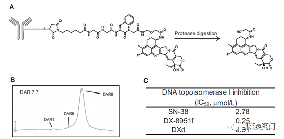 Enhertu是一种靶向HER-2阳性表达细胞的ADC药物,通过一种4肽连接子将靶向HER2的人源化单克隆抗体trastuzumab(曲妥珠单抗)与一种新型拓扑异构酶1抑制剂exatecan衍生物(DX-8951衍生物,DXd)链接在一起,阻断DNA复制过程,造成细胞死亡。同时也已证实DXd在拓扑异构酶I中抑制活性高于SN-38和DX-8951f。Enhertu的DAR接近8,是目前已上市获批其他ADC的2~4倍,有助于向靶细胞输送更多的药物。