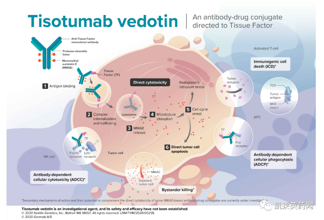 Tivdak是利用Seagen的ADC技术在Genmab的TF人源单克隆抗体基础上联合开发而成,该技术利用一个蛋白酶可裂解的linker将微管破坏剂monomethyl auristatin E(MMAE)共价连接到抗体上。非临床数据表明,Tivdak的抗癌机制是ADC与表达TF的癌细胞结合,随后ADC-TF复合物内化,并通过蛋白水解释放 MMAE。MMAE破坏分裂活跃的癌细胞的微管网络,导致细胞周期停滞和细胞凋亡。2021年9月20日,FDA批准Seagen和Genmab联合开发的Tivdak上市,用于治疗在化疗期间或化疗后病情进展的复发性或转移性宫颈癌成人患者。