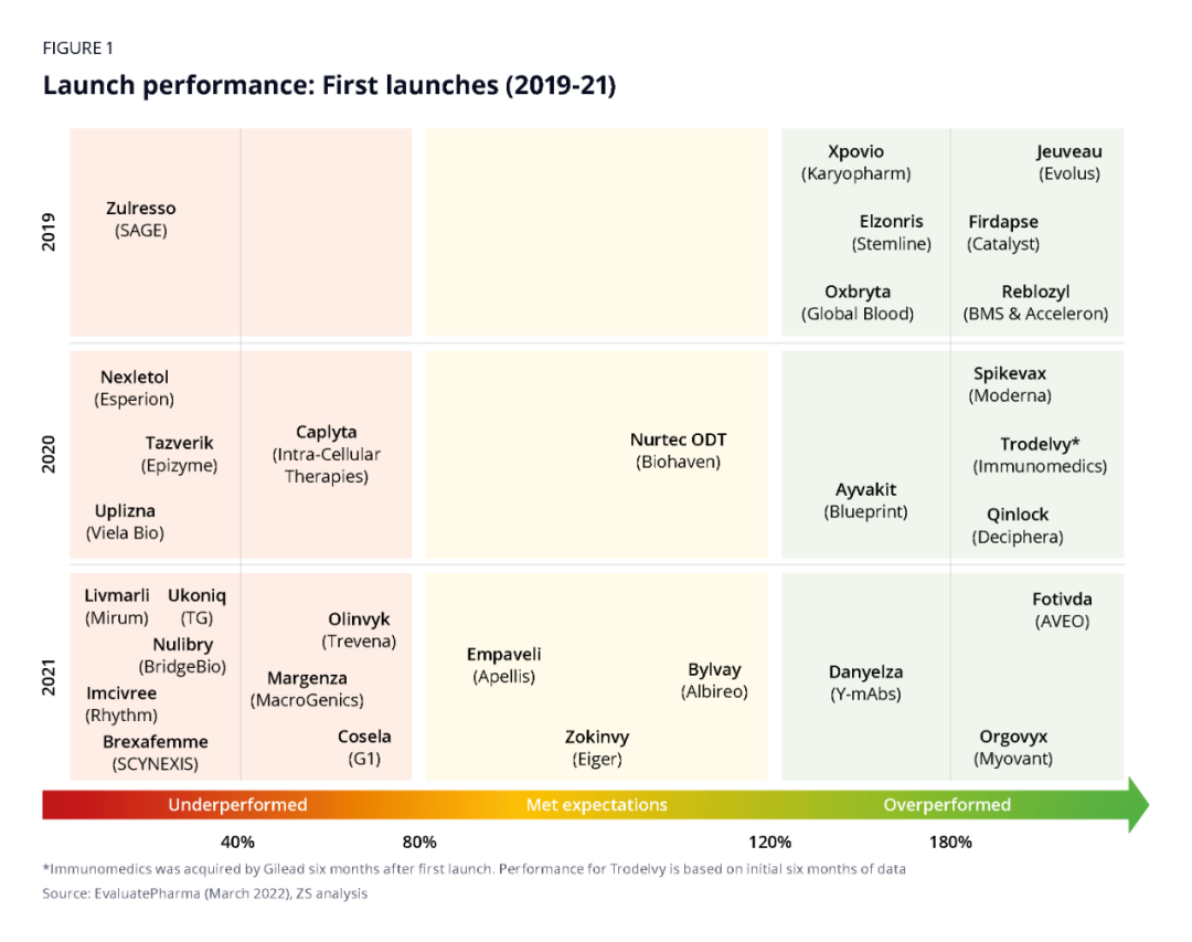 近年来,我们看到越来越多的新兴制药和生物技术公司上市了他们的第一个药物——有些是与其他公司合作开发和商业化的,有些是创新药企独立操刀的。为了了解哪些取得了上市成功,以及其成功的因素,ZS Associates 分析了 2019~2021 年期间在美国首次上市新药的制药公司的业绩。将上市当年的实际销售额与上市前的预测进行比较,然后根据比较结果把新药归为以下三类:符合预期(达到分析师预期的 80%~120% 之间)、表现出色(超过预期的 120%)和表现不佳(低于预期的 80%)。