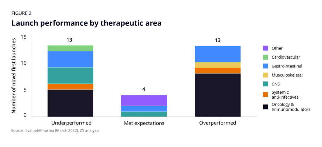 2019 年的样本量很小,而 COVID-19 爆发的 2020 年和 2021 年,商业表现不佳的情况更突出。如果只看这两年,超过一半(23 家中的 12 家)的首发新药的制药公司表现不佳。如果仅仅跟 2019 年的结果进行比较,就得出 COVID-19 导致制药公司商业表现不佳的结论,这样的论断有点不负责任,也经不起推敲。但我们可以推测,制药和生物技术公司接触 HCP 的机会减少,以及医生就诊量的总体减少,抑制了新药的处方。虽然业绩表现是跨越治疗领域的问题,但中枢神经系统和胃肠道领域的新药最有可能表现不佳——3/4 的新药未达预期。肿瘤和免疫治疗表现更好,有 60% 的新药超出预期。其余领域,超过 3/4 的新药达到或超出了预期。