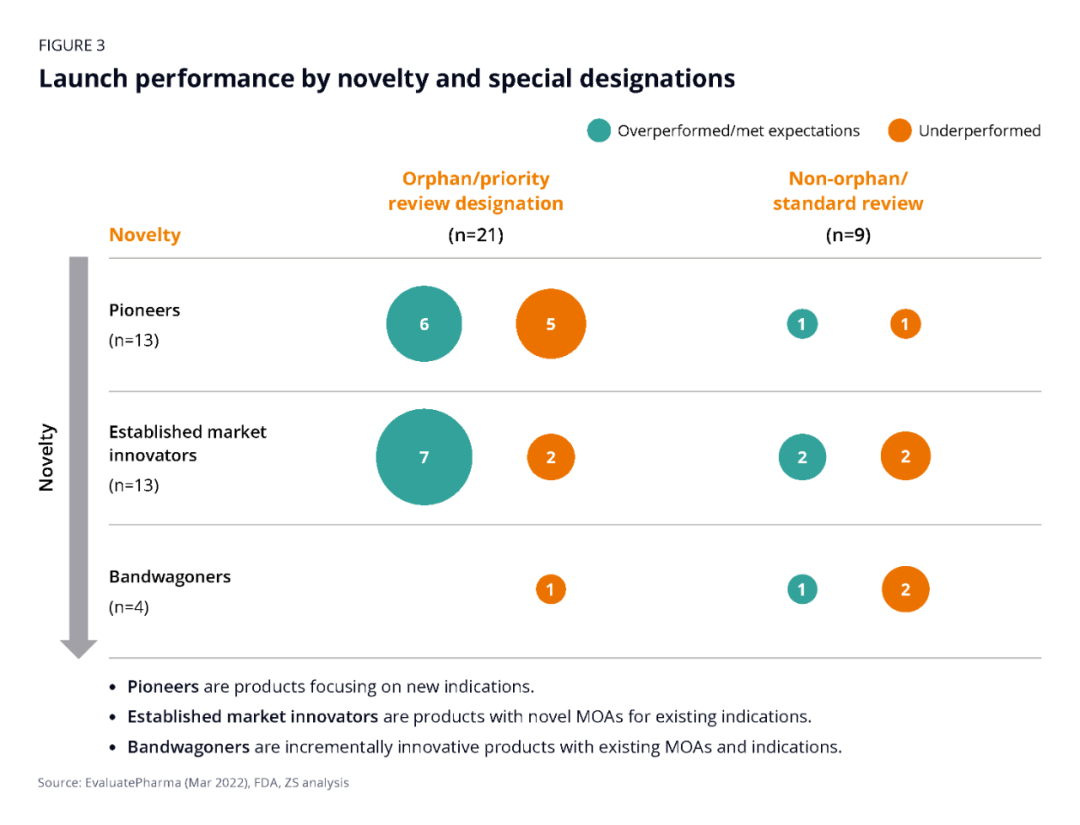 为了更好地理解首次上市新药成功或失败的原因,我们将药物分为三类:领域先驱(13)、成熟市场的创新者(13)和“跟风者”(4)。另外,也分析了上市策略、市场准入以及孤儿药和优先审查状态等因素。在 26 种先驱型药物和成熟的市场创新药中,超过 60%(16)达到或超出了预期。另一方面,跟风者的表现则要差得多,其中 3/4 表现不佳。