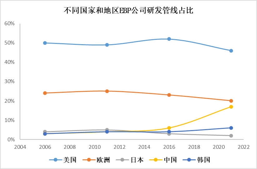 在过去5年里, EBP公司开发的在研产品数目翻了一倍,90%的EBP公司研发活动集中在美国、欧洲、中国、日本和韩国这5大区域。