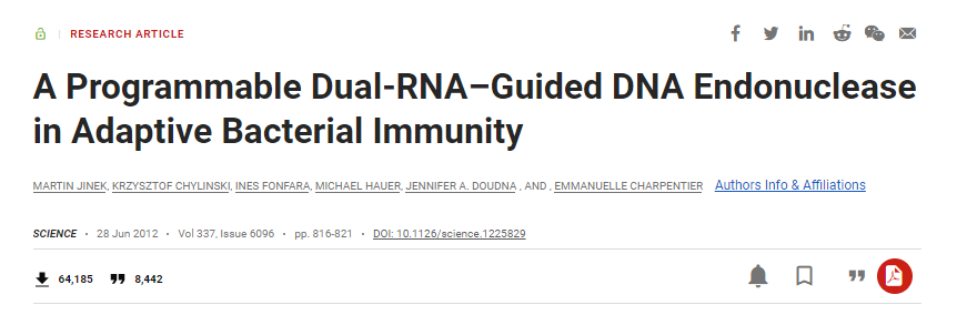 [1] Martin Jinek et al., (2012), A Programmable Dual-RNA–Guided DNA Endonuclease in Adaptive Bacterial Immunity, Science, DOI: 10.1126/science.1225829