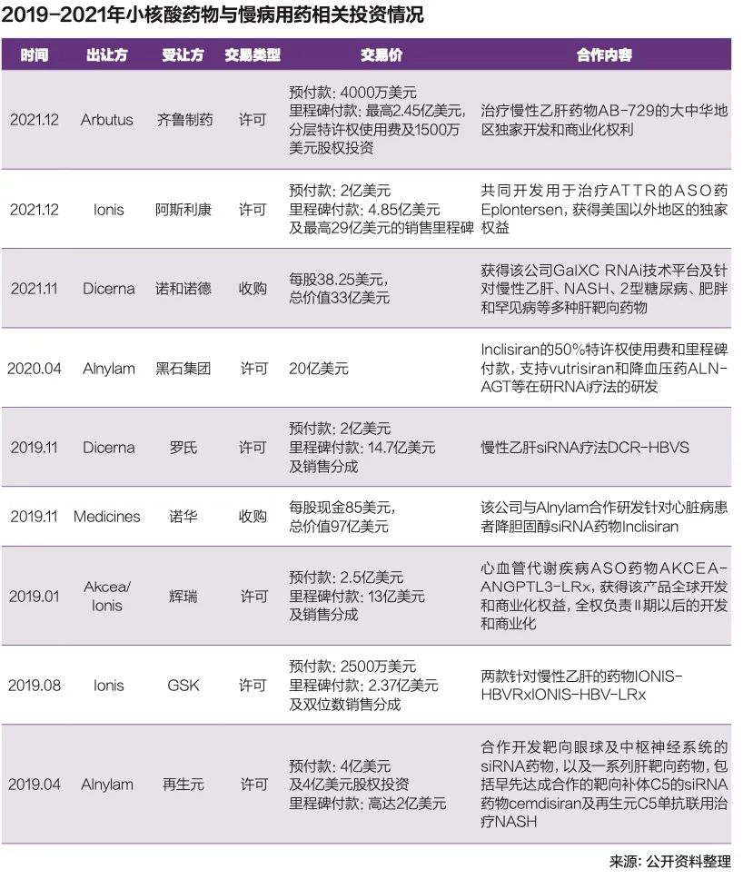 行业普遍观点认为,相比于抗体和小分子药物,小核酸药物具有候选靶点丰富、研发周期短、临床开发成功率高等优点。因此,在慢病用药方面,更具有先天优势。