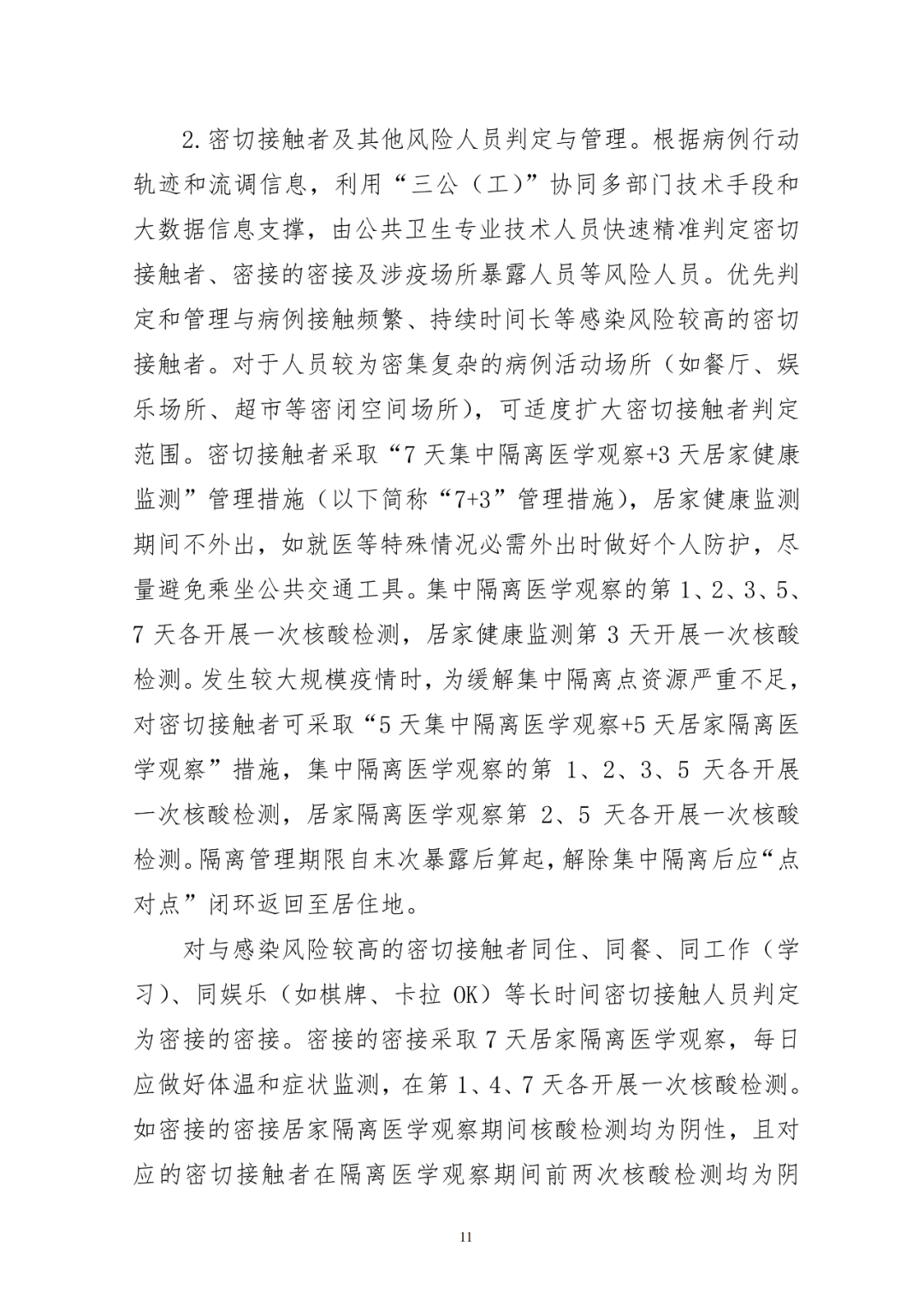 将密切接触者、入境人员隔离管控时间从“14天集中隔离医学观察+7天居家健康监测”调整为“7天集中隔离医学观察+3天居家健康监测”,核酸检测措施从“集中隔离医学观察第1、4、7、14天核酸检测,采集鼻咽拭子,解除隔离前双采双检”调整为“集中隔离医学观察第1、2、3、5、7天和居家健康监测第3天核酸检测,采集口咽拭子”,解除集中隔离医学观察前不要求双采双检。密接的密接管控措施从“7天集中隔离医学观察”调整为“7天居家隔离医学观察”,第1、4、7天核酸检测。