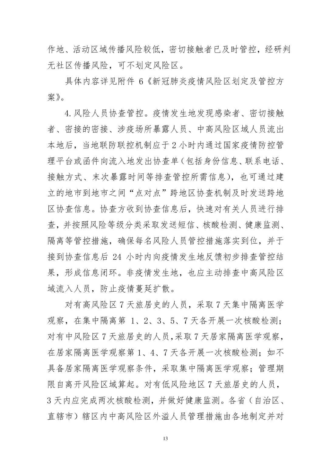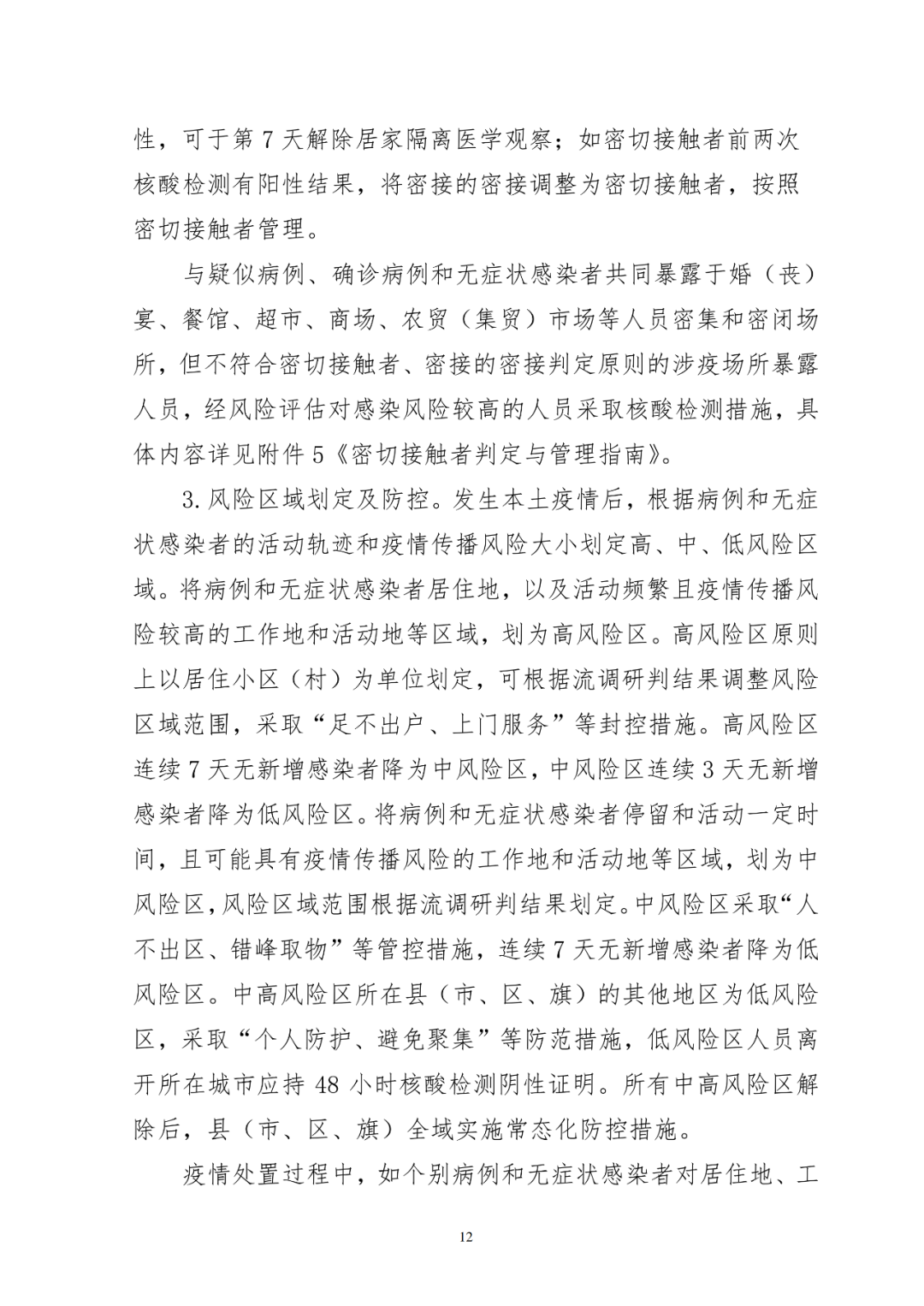 将两类风险区域划定标准和防控措施进行衔接对应,统一使用中高风险区的概念,形成新的风险区域划定及管控方案。高风险区实行“足不出户、上门服务”,连续7天无新增感染者降为中风险区,中风险区连续3天无新增感染者降为低风险区。其他地区对近7天内有高风险区旅居史人员,采取7天集中隔离医学观察措施。中风险区实行“足不出区、错峰取物”,连续7天无新增感染者降为低风险区。其他地区对近7天内有中风险区旅居史人员,采取7天居家医学观察措施。低风险区指中、高风险区所在县(市、区、旗)的其他地区,实行“个人防护、避免聚集”。其他地区对近7天内有低风险区旅居史人员,要求3天内完成2次核酸检测。