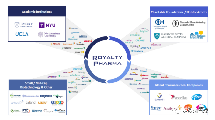 由于不少科研机构、大学、行业协会以及中小型医药公司为已经商业化的药物做出了前期的研究,进而持有这些药物的部分权益。而Royalty Pharma则是与这些机构合作,购买药品的特许权。比较典型的案例有: