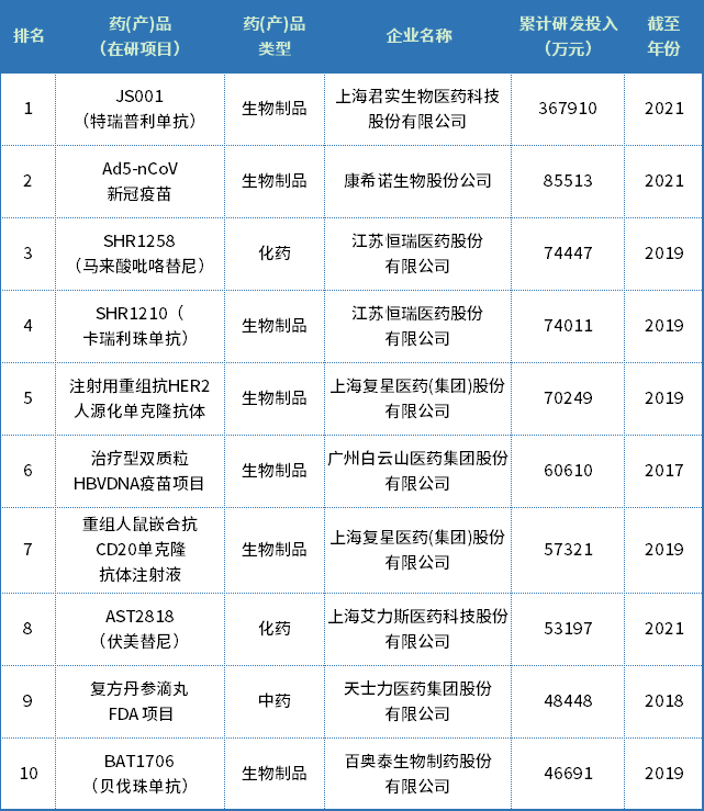 据药智上市企业产品研发明细数据库统计,这10个项目累计研发投入最多: