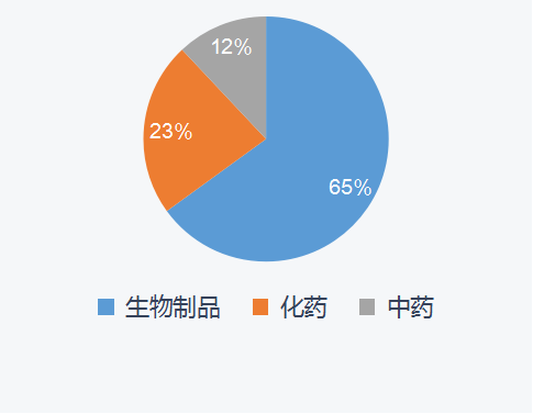 按照药品类型统计,这100个产品(项目)中,生物制品占比超过一半,为65%,化药和中药占比分别为23%和12%。