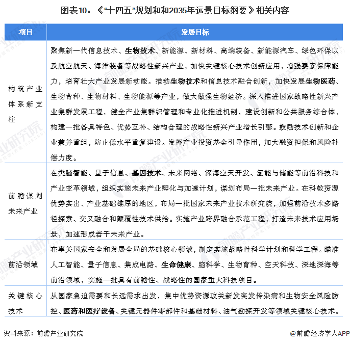 依据《“十四五”规划和和2035年远景目标纲要》,战略性新兴产业是引导未来经济社会发展的重要力量,加快培育和发展战略性新兴产业作为我国推进产业结构升级、加快经济发展方式转变的重大举措,第十四个五年(2021-2025年)规划着眼于抢占未来产业发展先机,培育先导性和支柱性产业,推动战略性新兴产业融合化、集群化、生态化发展,战略性新兴产业增加值占GDP比重超过17%,国家《规划纲要》关于生物医药产业的发展定位条款摘录如下表: