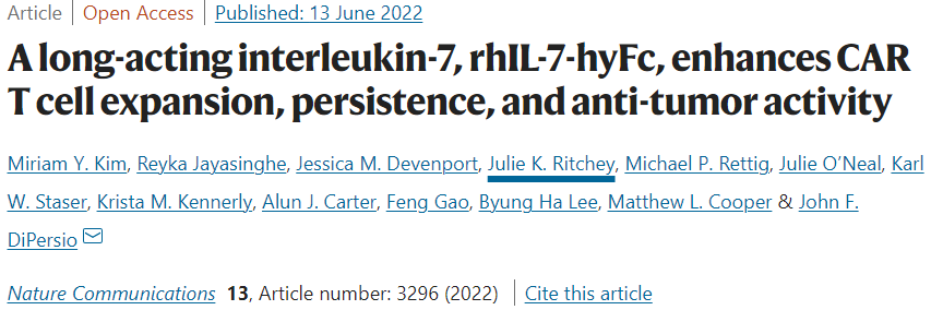 2# Miriam Y. Kimet al. A long-acting interleukin-7, rhIL-7-hyFc, enhances CAR T cell expansion, persistence, and anti-tumor activity. Nature Communications. (2022)