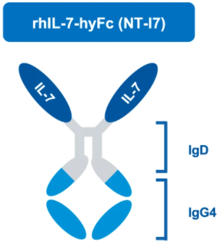 NT-I7(又称efineptakin alfa, rhIL-7-hyFc)是一种与IgD和IgG4元件融合的工程化二聚体IL-7(hyFc©),可减少补体激活,同时延长体内血清半衰期,为寿命较短的天然重组人IL-7(rhIL-7)提供明显的药理优势。