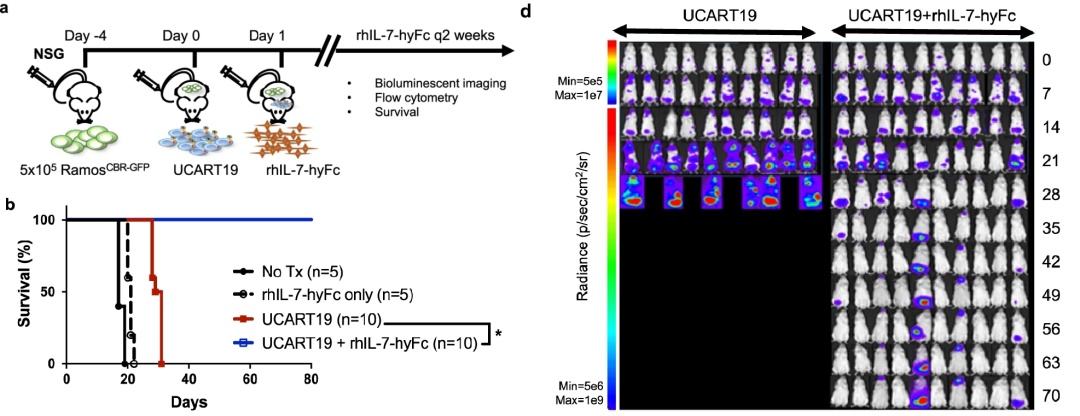 在首次健康志愿者的人体试验 (NCT02860715)中,单剂量肌肉注射NT-I7(60 mcg/kg)导致CD4+ 和CD8+ T细胞数量大幅增加,未报告重大不良事件或剂量限制性毒性。因此,研究人员决定探索这种试剂增强CAR-T细胞活性的潜力。