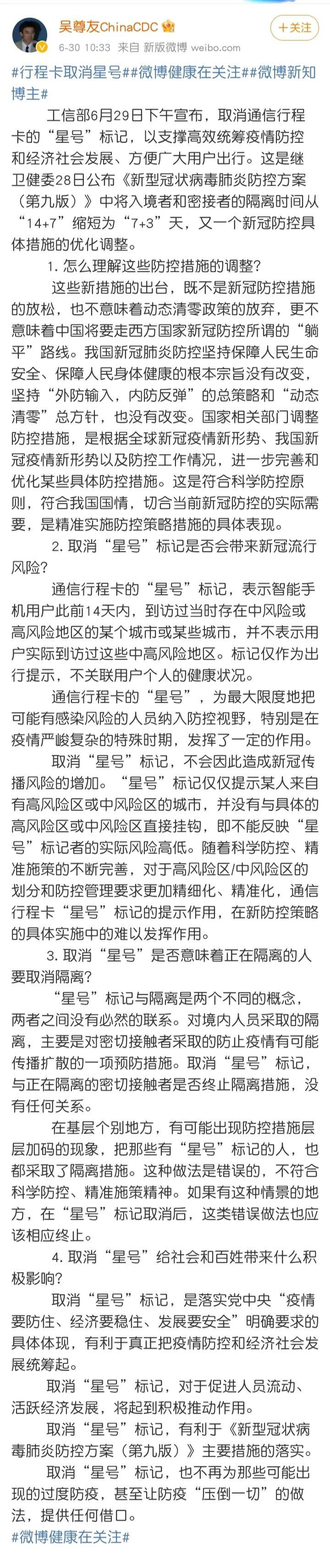 6 月 30 日,针对日前工信部宣布的取消通信行程卡的「星号」标记的通知,中国疾控中心流行病学首席专家吴尊友在微博发表长文,表示取消「星号」标记并不意味着动态清零政策的放弃,也不会造成新冠传播风险的增加,要点如下: