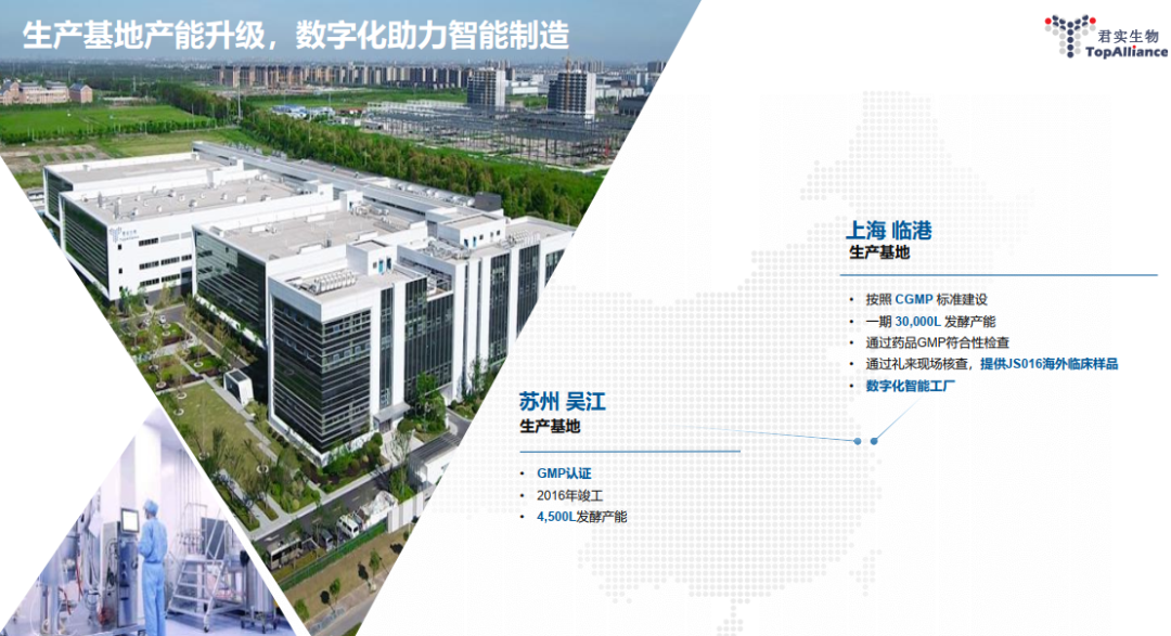 公司位于临港新片区内的生产基地占地80亩,总建筑面积70,000平米,一期项目生产规模达30,000升,严格按照国际药品生产质量管理(cGMP)进行建造。
