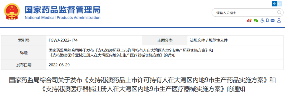 为贯彻落实《粤港澳大湾区药品医疗器械监管创新发展工作方案》,推进粤港澳大湾区药品上市许可持有人、医疗器械注册人制度改革,现发布《支持港澳药品上市许可持有人在大湾区内地9市生产药品实施方案》和《支持港澳医疗器械注册人在大湾区内地9市生产医疗器械实施方案》,请你局认真落实。