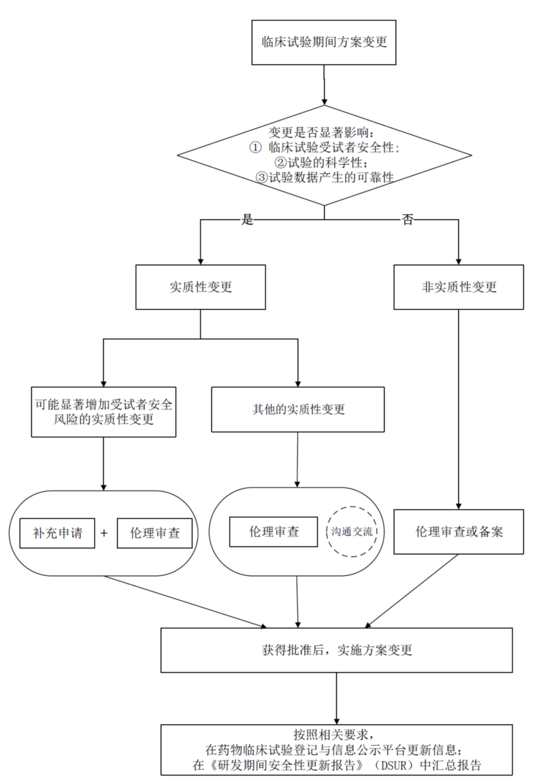 1) 针对临床期间的变更,《药品注册管理办法》第二十九条有明确要求:药物临床试验期间,发生药物临床试验方案变更、非临床或药学变化或有新发现的,申请人应当按照规定,参照相关技术指导原则,充分评估对受试者安全的影响。申办者评估认为,不影响受试者安全的,可以直接实施,并在研发期间安全性更新报告中报告,可能增加受试者安全性风险的,采取补充申请的方式进行管理。申报途径的关注点是——安全性风险的增加,这也体现了CDE从监管角度的关注重点。