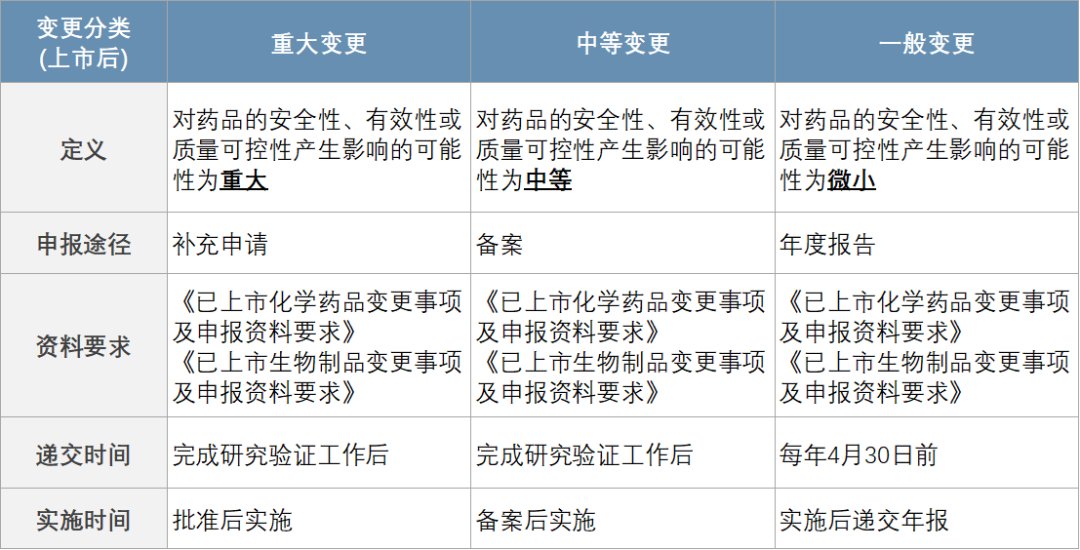 1)2021年1月13日,国家药监局颁布了《药品上市后变更管理办法(试行)》(以下简称《变更管理办法》),将变更从程度上分级为重大/中等/微小,对应的监管路径分别是审批/备案/报告,基于风险等级给予了中等和微小变更的实施灵活度,减轻了变更给企业带来的运营困难。