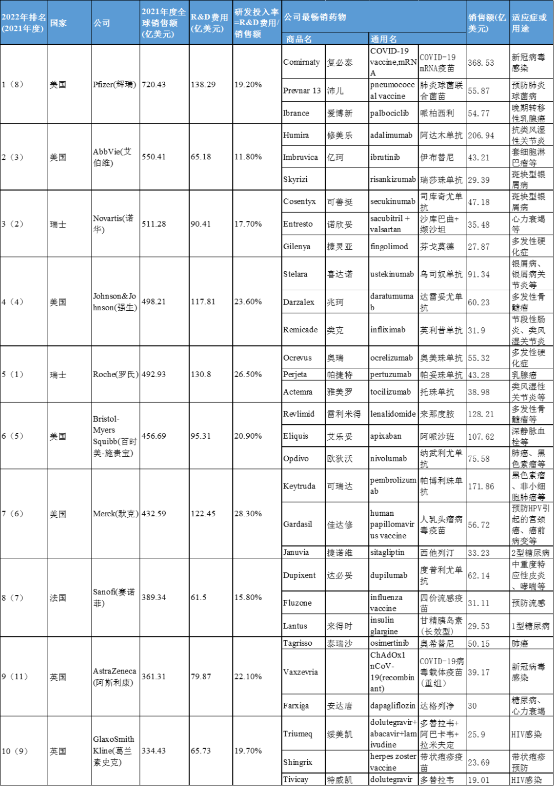 50强中有44个公司销售额取得了增长(含4个新进公司应该有增长才进入榜单),增幅最大的是辉瑞,因其新冠疫苗复必泰畅销而增长了364.35亿美元;6个公司的销售额同比下降,降幅最大的是美国亚力兄,销售额降低了22.65亿美元,因为2021年7月22日阿斯利康完成了对亚力兄的收购,所以亚力兄只计算了2021年1月至2021年6月的销售数据,同时研发投入也被合并到阿斯利康中。50强中有36个公司的研发投入有增长,5个公司研发投入有降低,4个未有研发投入数据,5个新进入公司未有可比数据。从每个公司的前三畅销药可以推算出有些公司还是比较专注在某个治疗领域,如葛兰素史克和吉利德聚焦在病毒感染,诺和诺德专注在糖尿病,礼来重点也在糖尿病,百健重点聚焦在多发性硬化症,澳大利亚CSL重点在人血蛋白,福泰制药专注在囊性纤维化,较多企业如百健、福泰制药还有亚力兄等在罕见病领域有特长。