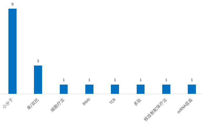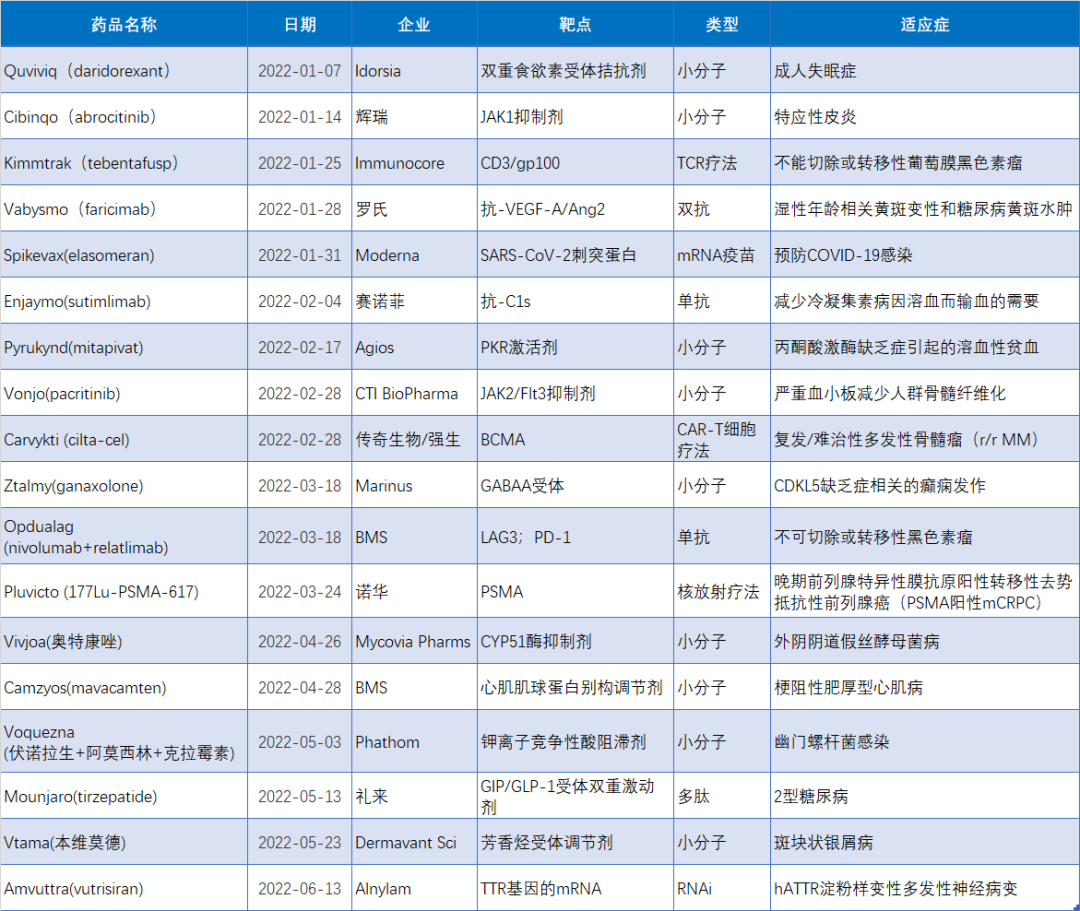 2022年上半年,FDA共批准了16款新分子实体/新生物制品,还批准了1款细胞疗法,1款疫苗。从技术类型上看,包括9款小分子药物,2款单抗,1款双抗,1款T细胞受体(TCR)疗法,1款RNAi疗法,1款核放射配体疗法,1款多肽,1款CAR-T细胞疗法以及1款mRNA疫苗。