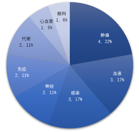 从疾病类型上看,上半年FDA批准的新药在各个领域分布较均匀,肿瘤药4款(22%),血液疾病和抗感染病药物各3款(17%),神经、免疫、代谢性疾病领域各有2款,心血管,眼科各有1款。