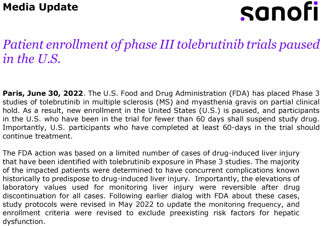 近日,制药巨头赛诺菲发布消息称,美国食品药品监督管理局(FDA)已将tolebrutinib(SAR442168)用于多发性硬化症(MS)和重症肌无力(MG)的3期临床研究部分暂停。因此暂停了该试验的患者入组,在美国参加试验少于60天的参与者应暂停研究药物。在试验中完成至少60天的美国参与者应继续治疗。