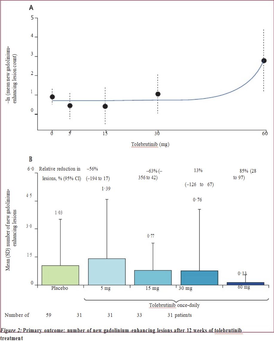 2021年9月,tolebrutinib的最新2b期研究结果发表在《柳叶刀-神经病学》上,数据显示tolebrutinib可使MS患者新发钆增强病变数量呈剂量依赖性减少,其中60mg剂量组疗效最优,同时药物的总体安全性良好。