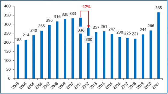 ▲图 1 阿斯利康全球销售收入变化情况(单位:亿美元)数据来源:阿斯利康2004年-2021年年报