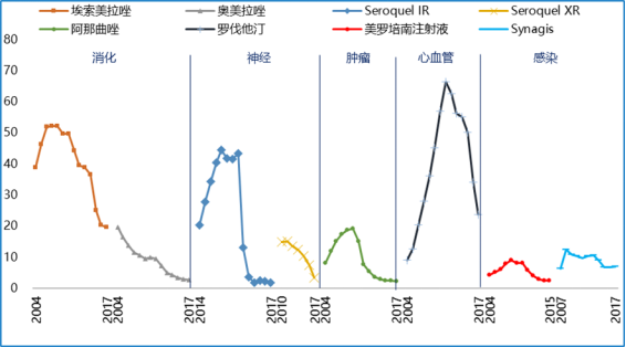 2012年-2017年阿斯利康的市场表现不容乐观,究其根本原因则在于曾经的多个核心产品专利保护到期,导致全球销量持续下滑。
