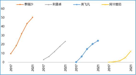 ▲图 3 阿斯利康肿瘤领域核心药物销量表现(单位:亿美元)数据来源:阿斯利康2004年-2021年各年年报