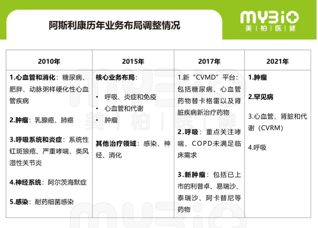 ▲表 1 阿斯利康历年业务布局调整情况 资料来源:根据阿斯利康2004年-2021年各年年报整理 备注:New CVMD:New Cardiovascular & Metabolic Diseases;CVRM:Cardiovascular, Renal and Metabolism