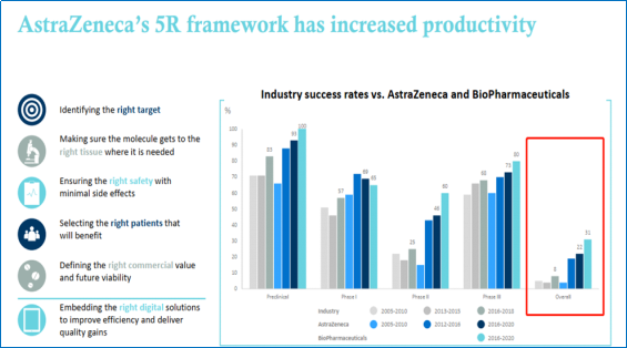 阿斯利康“5R”研发框架使其在2016年-2020年间研发成功率达到22%、其生物制药研发成功率达到31%,远高于制药行业2016年-2018年间8%的研发成功率。