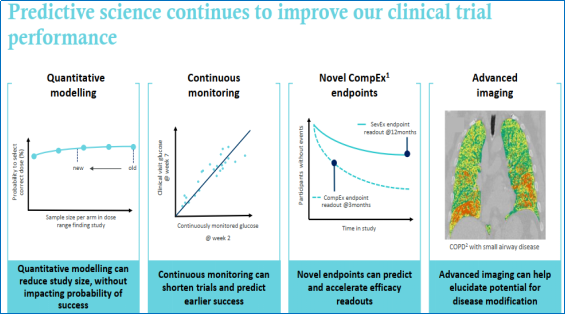 此外,阿斯利康还致力于运用预测性科学改进临床试验效率,从而进一步提升研发生产力。例如,通过建立科学模型以减少临床试验所需患者人数、对患者进行持续动态的数据监测以更早预测临床试验结果、使用创新的临床终点以预测和加速疗效读取、运用先进影像技术阐明药物对改变疾病进程的潜力。