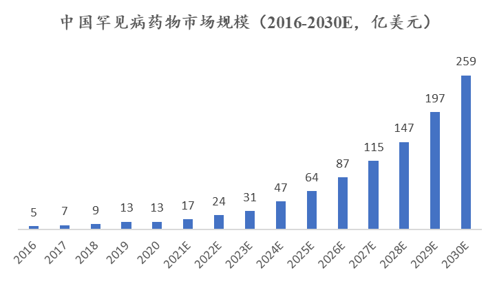 图1 中国罕见病药物市场规模(2016-2030E,亿美元)
