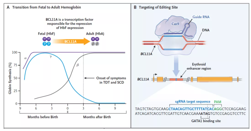 ▲CTX001的作用机制:A,BCL11A是下调胎儿血红蛋白表达的转录因子;B,CTX001通过对BCL11A进行基因编辑,上调胎儿血红蛋白的表达(图片来源:参考资料[5])