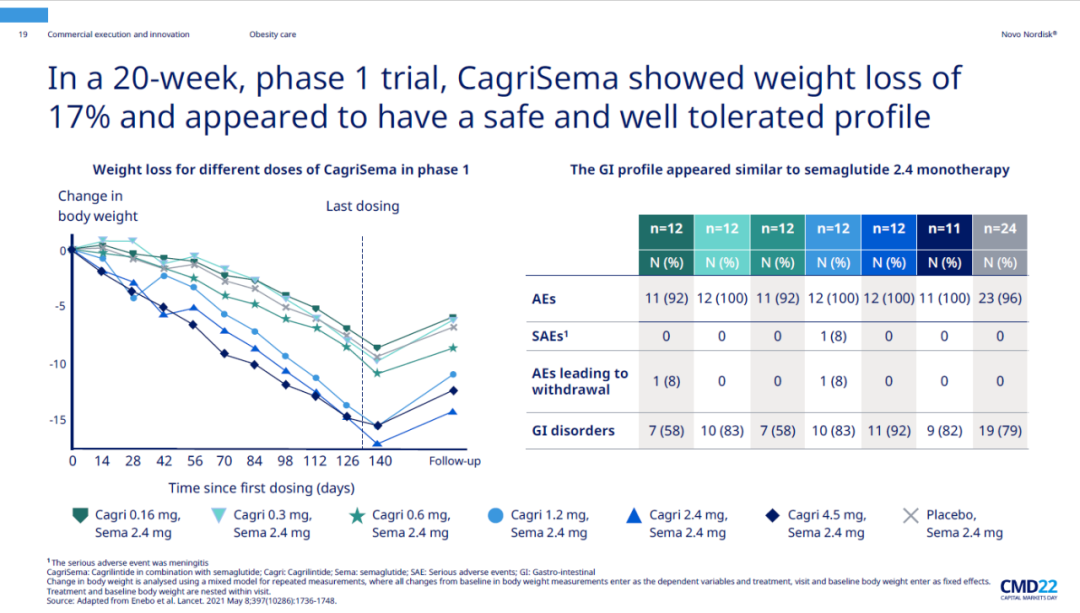 ▲Cagrilintide与司美格鲁肽联用的1期临床试验结果(图片来源:诺和诺德官网)
