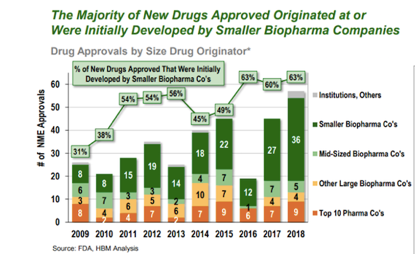 Biotech是“啃下”早期药物研发这块“硬骨头”的主力之一,同样在FDA每年批准的新药中,biotech居功至伟。根据FDA等的数据,自2011年至2018年,Biotech上市的新药占到了FDA批准总数的50%左右,其中2016年-2018年,这一比例超过了60%。