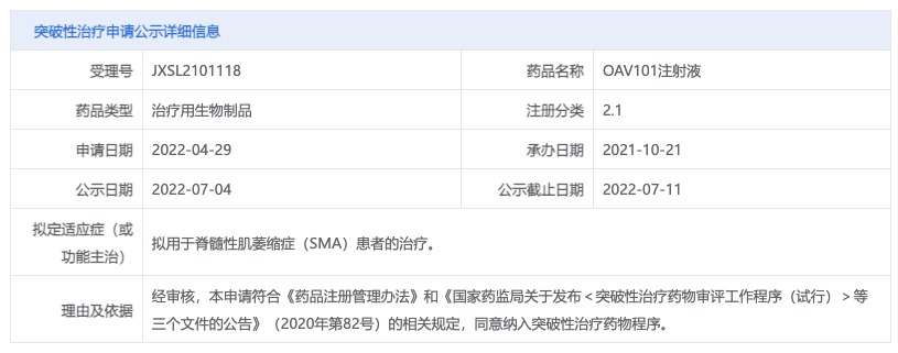7 月 4 日,据 CDE 官网显示,拟将诺华的 OAV101 注射液纳入突破性疗法,拟用于脊髓性肌萎缩症(SMA)患者的治疗(受理号:JXSL2101118)。