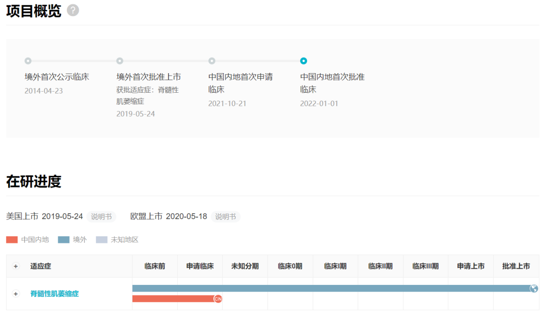 目前,针对 SMA 已有 3 种疗法获批,分别是渤健/Ionis 开发的反义寡核苷酸药物 Spinraza(诺西那生钠)、罗氏的口服疗法 Evrysdi(利司扑兰)以及诺华的 Zolgensma。前两款如今均已在国内获批上市,诺华的 Zolgensma 紧随其后,也启动了临床试验。