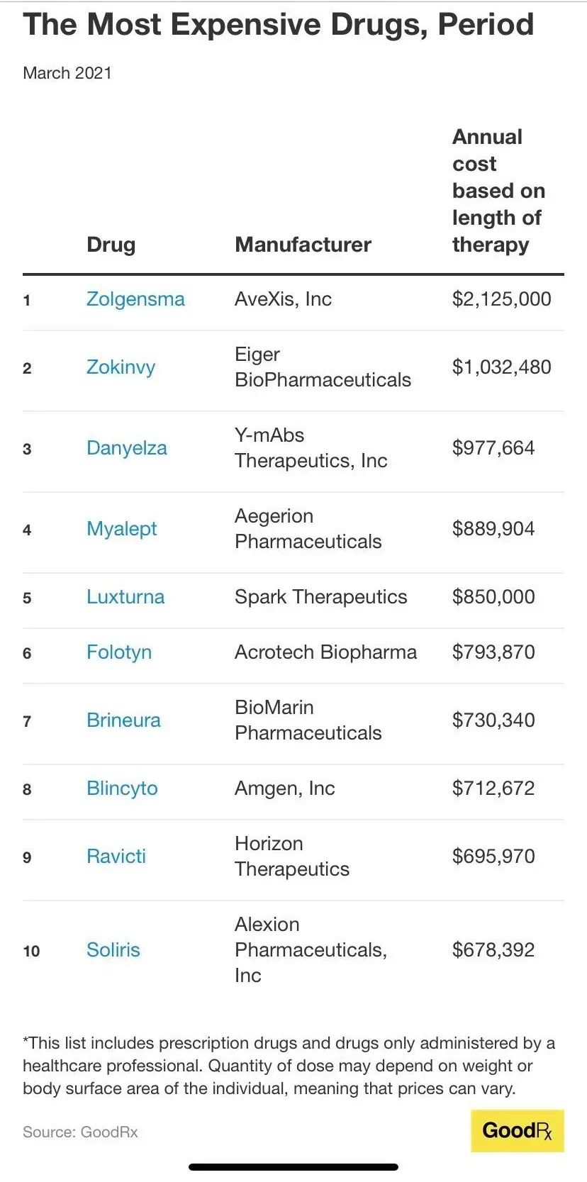 在 2021 年美国处方药搜索平台 GoodRx 发布的药物价格榜单之中,Zolgensma 以 212.5 万美元(约合 1380 万元)的价格高居榜首。同年其销售额增长 47%,为诺华带来了 13.5 亿美元收入。今年 1 月 Zolgensma 在中国获批临床,正式开启了该药在中国的征程。