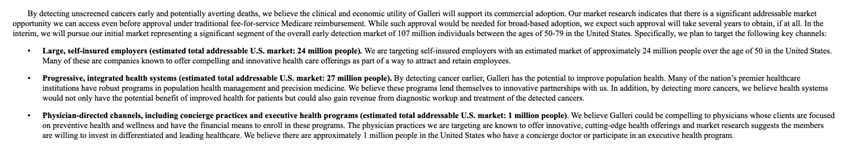 除此之外,根据Grail的收入结构,Galleri产品在美的商业化渠道主要有三个:商保/卫生系统、医生和大企业渠道。其中以商保/卫生系统(预估全美潜在市场2700万人)和大企业渠道(预估潜在市场2400万人)为主要盈利渠道。