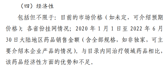 按照规则,国家医保局要求企业在PPT填上申报品种的基本信息,从2020年1月1日至2022年6月30日在中国大陆地区的销售金额,主要创新点等;此外,规则要求企业提交“同治疗领域药品”“同通用名药品”的上市情况、经济性、临床价值等对比信息。